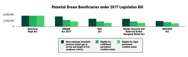 来自移民政策研究所的一份新 报告 研究了目前在审议中的五项不同立法提案,所有这些提案都将解决这些梦想者的法律地位。每项提案都按其覆盖范围进行细分:有多少人将有资格获得合法身份;有多少人最终可以获得有条件的永久居民身份;以及有多少人最终可以获得绿卡。