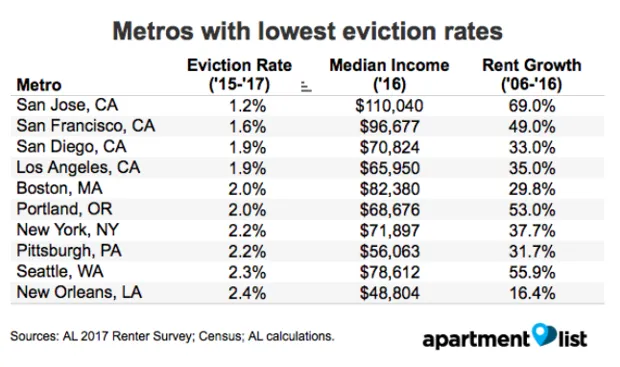 然而,这些趋势揭示了公寓列表研究的固有限制:它只从大都市层面考察城市。“如果你从更细致的地理基础来看结果,在像旧金山这样的城市,你会发现城市核心内的某些区域驱逐率要高得多,”萨尔维亚提说。“但由于我们在看整个大都市,这与所有富裕的郊区平均在一起,而那些地方驱逐相当少。”