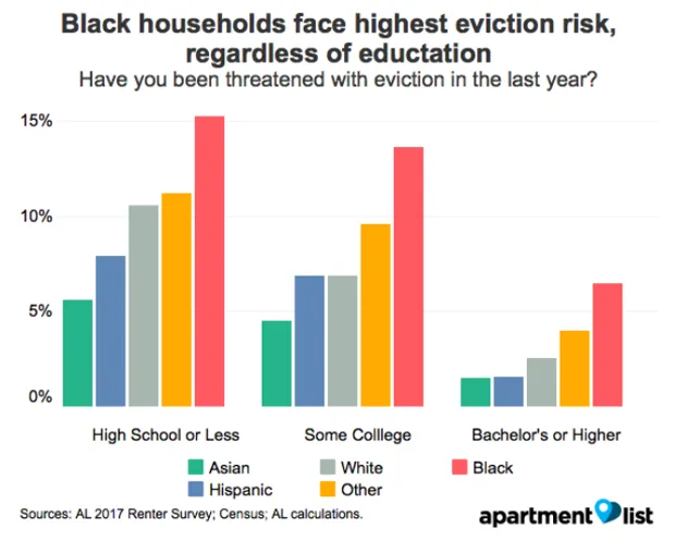 但是如果你开始控制教育水平,仍然是黑人家庭面临的风险最大。“即使是查看拥有四年学位的家庭,我们发现6%的黑人家庭面临驱逐,而只有3%的白人家庭——这个比例是两倍,”萨尔维亚提说。“而且这种分类在所有教育水平上都是成立的。”