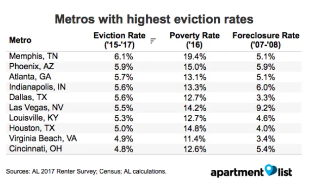 人们可能会认为,住房成本最高的城市——像旧金山、圣荷西、波士顿和纽约市这样的沿海城市——正在驱逐最多的居民。但最严重的地方是那些中位收入低且止赎率高的地方,如孟菲斯、凤凰城和亚特兰大。许多居民经历最高驱逐率和租赁不安全感的城市集中在南部和中西部。