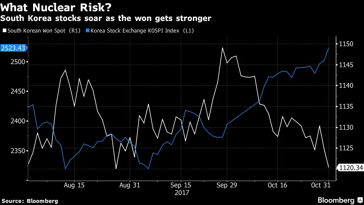 韩国在十月表现强劲或许十月份市场上最大的惊喜是尽管关于核弹头的剑拔弩张,韩国市场依然强劲。韩元对美元上涨了2.23%,超过了彭博社追踪的其他30种主要货币。基准的Kospi股票指数上涨了5.39%,是多年来最佳的月度表现之一。分析师们甚至在经济在第三季度以3.6%的年化速度增长后提高了他们的增长预测,这得益于强劲的外部需求和政府的财政支出。彭博新闻报道,Kospi现在有望在未来12个月内超越该地区其他所有主要亚洲股票基准,基于该地区每个指数成员的12个月价格目标的总和。这些预测暗示Kospi将上涨约19%。韩国和中国周二同意超越围绕首尔决定部署美国导弹防御系统的长达一年的争议,为两大亚洲经济体之间的更紧密关系铺平道路。当天稍晚,韩国总统文在寅呼吁北朝鲜参加明年初在韩国举行的冬季奥运会。