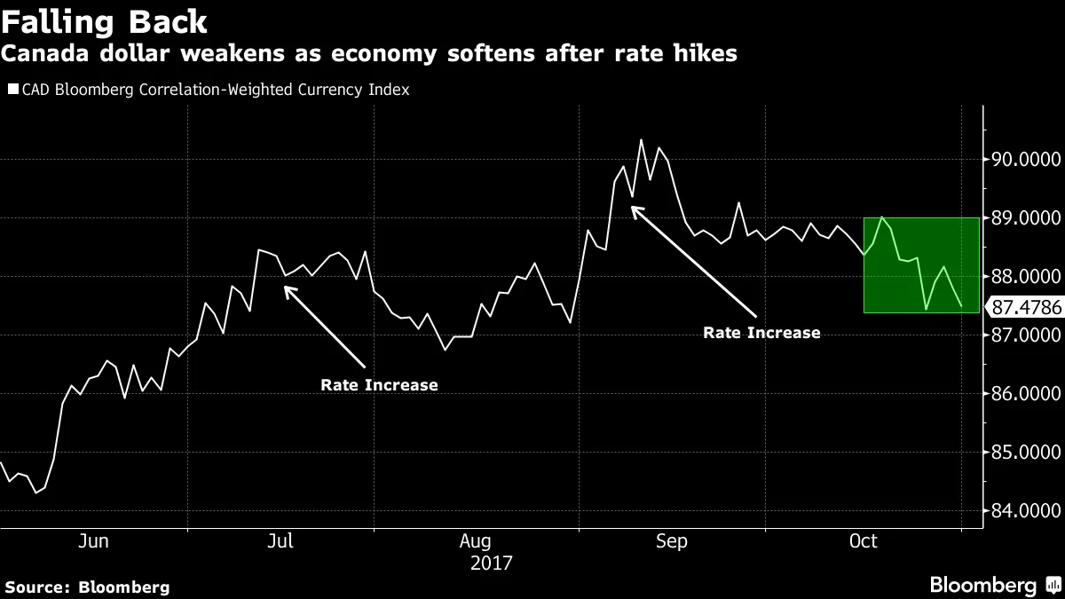 **他们在想什么?**这就是货币交易员们对加拿大银行及其上个季度的两次加息所说的,因为周二的一份政府报告显示,该国经济在八月份意外收缩。最新的失望进一步表明,降温过程正在进行中,根据彭博新闻的西奥菲洛斯·阿尔吉提斯和埃里克·赫茨伯格的报道,过去12个月的增长速度令人窒息。如果经济在九月份未能扩张,第三季度年化增长将有可能低于2%,而第二季度增长为4.5%。最近经济表现不佳是加元在十月份对一篮子主要货币首次下跌的主要原因,尽管油价已经上涨。即使在GDP报告之前,高盛的策略师们也将对加拿大银行再次加息的预期从12月推迟到3月,并下调了对加元的目标。该公司现在预计,加元在未来三个月内不会升值至每美元1.25,而是仅从当前的1.29升至1.28。