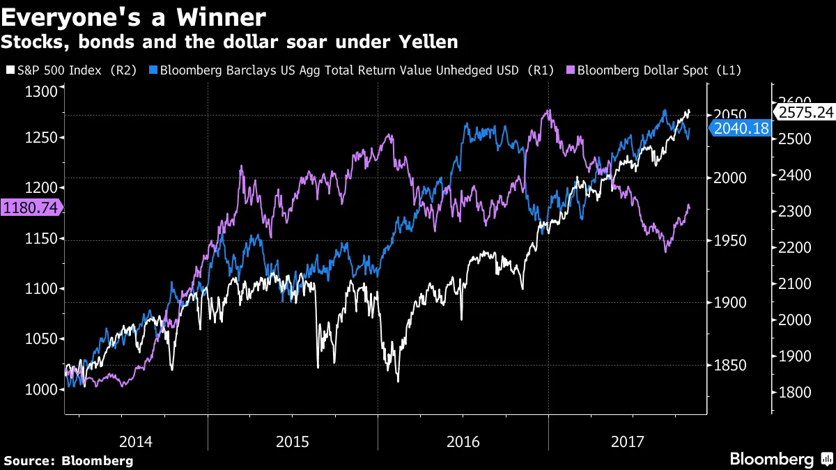 “在一个不受监管的市场上加上‘期货’市场的外衣以产生交易量,似乎是一个以利润为导向的举动,”Themis Trading的合伙人乔·萨卢兹在他的推特上说。“还记得金融危机期间那些糟糕抵押贷款的CDO外衣吗?加上外衣并不意味着安全。”CME的公告是在比特币的总价值超过1000亿美元的前一天发布的。比特币的价格在周三上涨了254美元,达到了6354美元,较一年前的约700美元上涨了不少。市场将会怀念耶伦特朗普总统计划在周四宣布下一任美联储主席的选择,彭博新闻报道他倾向于现任美联储理事杰罗姆·鲍威尔来领导美国中央银行。如果属实,周三结束的当前为期两天的美联储会议可能是耶伦主席的最后一次会议。因此,现在是审视美国主要市场在她任期内表现的好时机。考虑到她自2015年底以来监督了四次加息,并开始缩减美联储4.5万亿美元的资产负债表——许多人曾表示这些事件会导致市场崩溃,结果相当惊人。自2014年2月她担任主席以来,标准普尔500指数上涨了约39%,而不包括美国股票的MSCI全球指数仅上涨了6%。根据彭博巴克莱美国综合债券指数,美国债券市场的回报率为10%,而全球综合指数为2.69%。美元经历了复兴,彭博美元现货指数上涨了16%。没有任何主要货币是美元没有升值的。