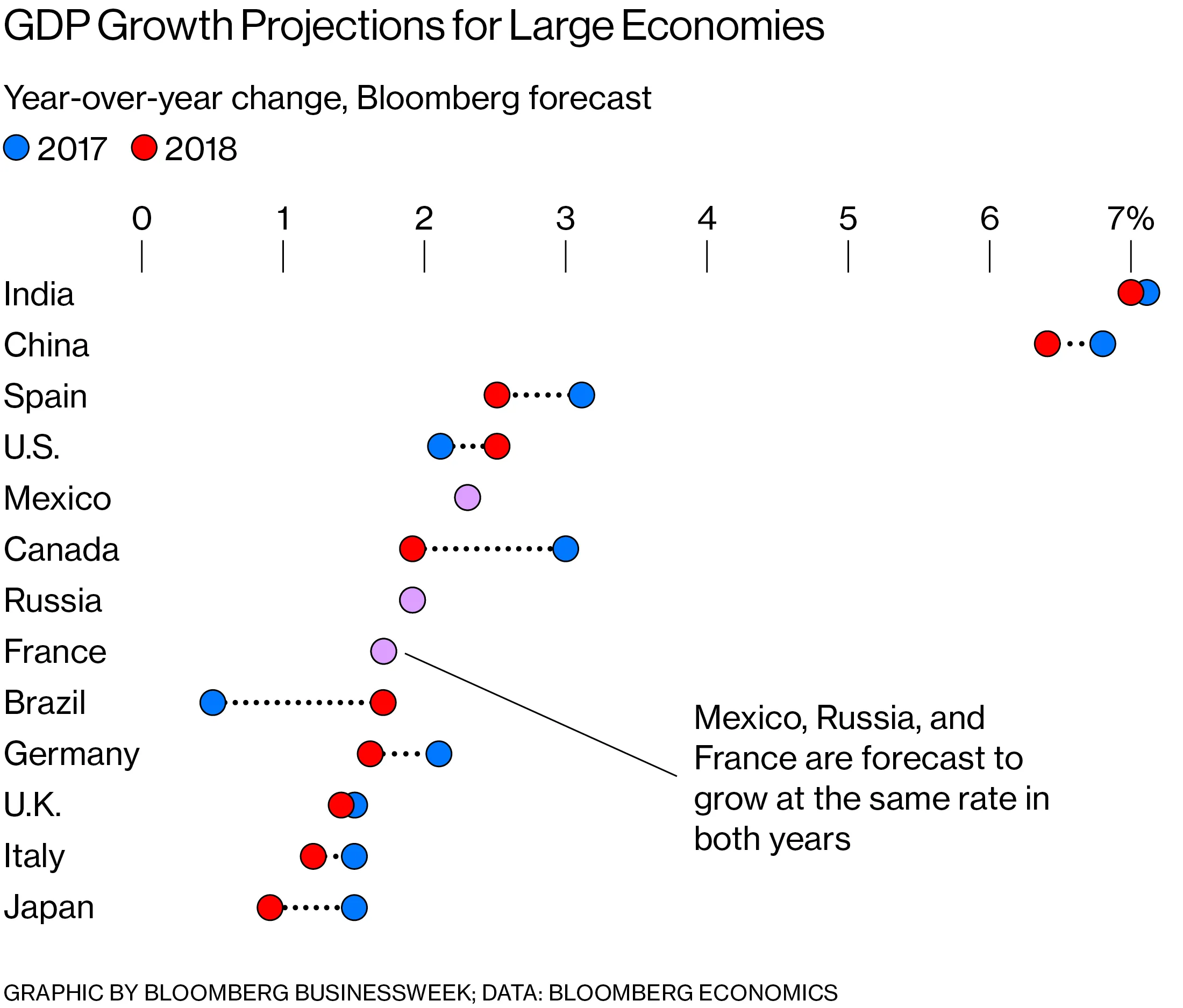 彭博社经济学家预测,美国2018年将增长2.5%;中国6.4%;日本0.9%;德国1.6%。在大多数情况下,这些数字与2017年预期的增长一致,而2017年被证明是一个比许多预测者预期的更好的年份。