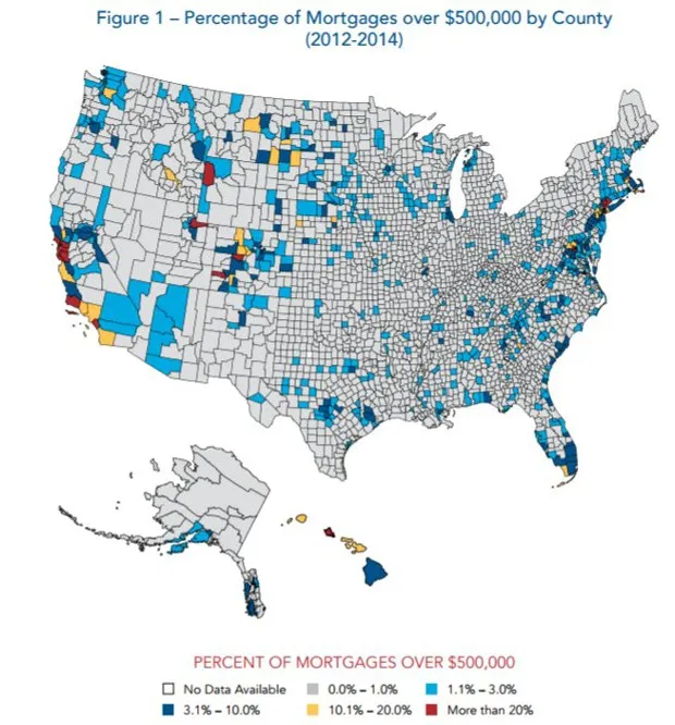 但即使在MID受益者中,贷款金额超过$500,000的人也寥寥无几。根据国家低收入住房联盟(NLIHC)的报告,在2012年至2014年间,只有5%的总抵押贷款超过了这个门槛。这些贷款大多集中在华盛顿特区、夏威夷和加利福尼亚的一些沿海住房热点。以下是按地理位置的细分: