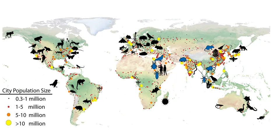 地图显示了城市演化研究的城市。标记为蓝色的城市代表共生物种——那些已经进化为与人类共同生活的物种。感谢杰森·穆希-南和马克·约翰逊在他们最新的 论文中,周四发表在期刊 科学上,约翰逊和他的同事杰森·穆希-南,纽约市福特汉姆大学的进化生物学家,回顾了近200项研究,其中大多数来自过去五年。“我们发现,[城市发展]经常影响进化,往往非常迅速,”约翰逊说。并且带来了意想不到的后果。