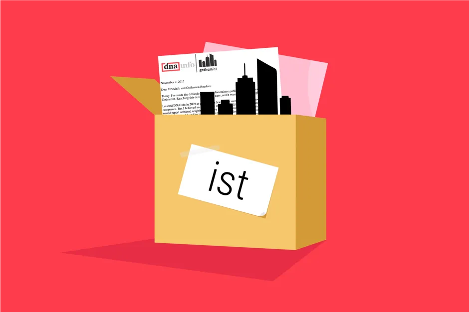 与此同时,一位几周前刚加入我们的作家正在尝试预览一篇帖子,但无法加载网站。另一位作家走过来帮助她,但当他终于成功刷新页面时,她的作品却无处可寻。相反,整个网站——已经运营了十多年——消失了。取而代之的是13年的工作,只有我们亿万富翁老板乔·里基茨的信,通知读者他做出了“艰难的决定”停止出版DNAinfo和Gothamist,我们的母站。