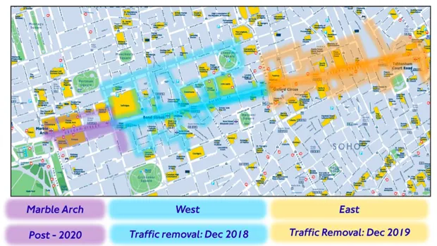 牛津街的步行化非常棘手,因为周围的城市在任何人想到内燃机之前就已经布局。这个街道(至少在某种意义上)几乎有两千年的历史,沿着古罗马道路Via Trinobantina的路径延伸到伦敦的西部。虽然按照伦敦的标准它相对宽阔,但它坐落在狭窄且迷宫般的街道之间,这意味着很长一段时间内,试图穿越城市的公交车和送货车辆几乎没有可行的替代路线。
