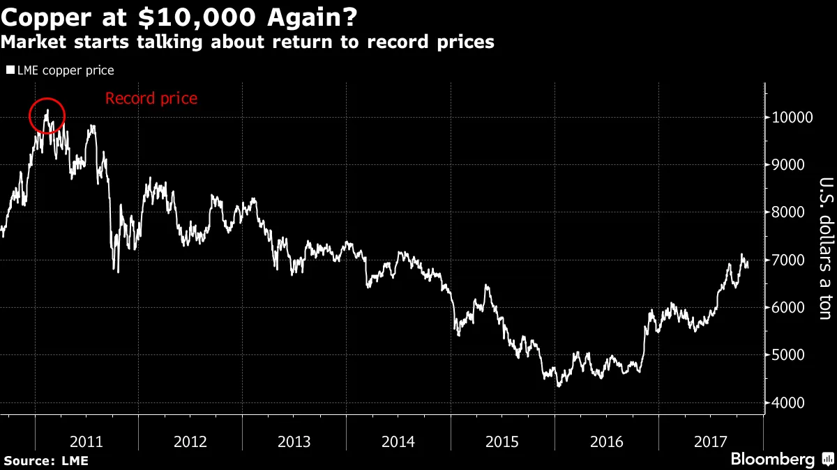 铜热潮达到新高度今年铜价在伦敦金属交易所上涨了23%,达到每吨6,820美元。市场的热潮吸引交易者进行高风险押注,认为价格将大幅上涨。彭博社的马克·伯顿报道,押注铜价在2018年12月之前超过每公吨10,000美元的看涨期权在过去两周开始交易,LME数据显示。总的来说,交易者在这些合约上花费了约450万美元。自2011年以来,铜价未曾达到这些水平,那时正值由中国这个最大用户推动的商品繁荣的高峰。大部分押注是在上周伦敦矿业行业年度会议期间进行的,这表明交易者对电动车驱动的需求变得越来越乐观。“这就像一张彩票,”Levmet U.K. Ltd.的基础金属和大宗商品高级分析师莱昂·韦斯特盖特告诉彭博社。如果期权到期时在价内,这些押注将获得丰厚回报。交易者在11月2日购买了250万美元的期权,如果铜价在明年12月达到10,200美元,将支付约1,000万美元,彭博社的数据表明。如果铜价达到10,500美元,这些期权的价值将达到2,880万美元。