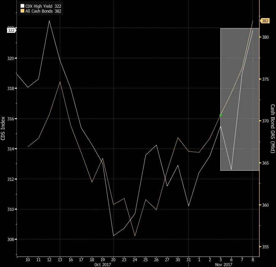 《华盛顿邮报》周二晚间报道,参议院税务撰写者正在考虑将20%的企业税率实施推迟一年,从目前的35%降至20%。在周三接受彭博电视采访时,财政部长史蒂芬·姆努钦表示,他并不排除推迟企业税率减税的开始,但强调政府的“强烈偏好”是希望在2018年生效。垃圾债券看起来很糟糕还有另一个市场也被视为早期预警系统,并且发出了与运输相同的信号。根据彭博新闻的塞巴斯蒂安·博伊德的说法,按一种衡量标准,企业垃圾债券经历了两个月以来最糟糕的一天,收益率差距扩大了5.5个基点。最初在通信和非周期性消费品等行业的疲软迅速演变为市场范围内的抛售。能源公司的债券是其他一些大输家。博伊德报告称,市场上一些最大公司的坏消息不断积累,投资者似乎是先卖出,后问问题。垃圾债券市场可能不需要太多因素就会遭受持续损失。关于更高杠杆比率的担忧已经存在了一段时间,尤其是在美联储没有放弃继续提高利率的计划的情况下。与垃圾相关的债务市场早已不再是一个小众市场,几乎没有人能争辩说它现在不是金融系统的威胁。标准普尔全球评级估计,截至6月30日,美国评级低于投资级的企业债务几乎达2.47万亿美元。其中约1.5万亿美元计划在2022年前到期,造成了再融资风险。