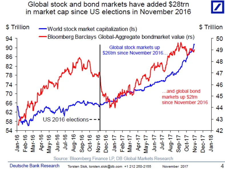 特朗普的胜利价值28万亿美元将所有功劳都归于唐纳德·特朗普几乎肯定是个错误,但根据德意志银行经济学家托尔斯滕·斯洛克的说法,自他一年前当选总统以来,全球股市的价值增加了260亿美元,债券市场又增加了2万亿美元。这相当于地球上每个男人、女人和孩子约3684美元,基于估计的全球人口为76亿。难怪法国外贸银行的策略师表示,该公司基于信用市场、股票、货币交易量、掉期利差以及黄金与股票的比率创建的情绪指标在本周达到了自2000年以来的最高水平。这些收益的所谓财富效应在很大程度上解释了最近美国、欧洲和新兴市场消费者和商业支出决策的上升,斯洛克表示。但也有谨慎的理由。“全球增长正在加速,过热和相关的通货膨胀上升的可能性显著高于衰退的可能性,”斯洛克在一份研究报告中写道。