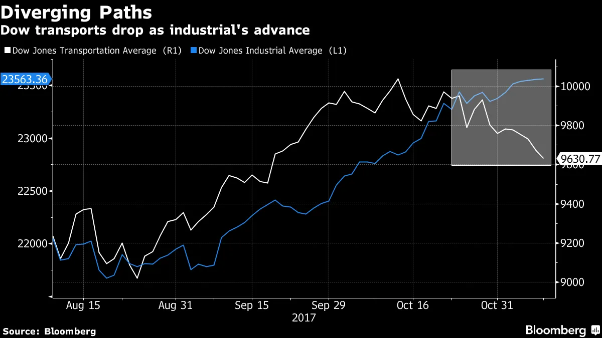 表面上,股票市场看起来相当不错。道琼斯工业平均指数、标准普尔500指数和纳斯达克综合指数继续缓慢攀升,创下新纪录。开始发出一些令人担忧信号的是一些更专业的指数。以道琼斯运输平均指数为例,该指数包含铁路和航空公司,有时被称为市场的早期预警系统。该指数与更广泛关注的道琼斯工业平均指数出现了背离,自今年10月12日以来,从高点下跌了4.06%。还有标准普尔500高贝塔指数,该指数在上升趋势的尾声往往比更广泛的市场失去动能。自10月中旬以来,该指数基本持平。最后,标准普尔500动量美国美元指数在周三创下三周以来的最大跌幅。一些策略师表示,要让股票继续上涨,华盛顿在减税方面需要有实质性进展,以证明其高估值的合理性。然而,消息似乎对股票多头不利。