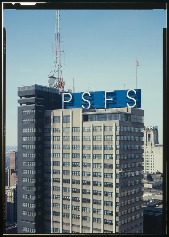 1985年的PSFS大楼杰克·E·布歇尔/历史美国建筑调查,国会图书馆自1932年这座最初是费城储蓄基金协会的塔楼开放以来,27英尺高的霓虹字母“PSFS”便在费城天际线上闪耀。作为全国首批现代摩天大楼之一,它于2000年以1.15亿美元和税收抵免改建为洛伊斯费城酒店。