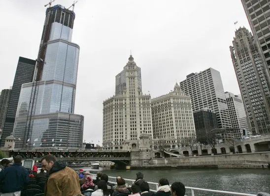 2008年,乘坐建筑游船的游客在未完工的特朗普国际酒店和塔(左)与论坛大厦(右)之间欣赏威利建筑(中)。Nam Y. Huh/AP作为芝加哥最具标志性的建筑之一,这座西班牙风格的婚礼蛋糕位于壮丽一英里,由口香糖大亨威廉·威利于1920年代初建造。它的7000万美元的翻新于2012年利用了联邦历史税收抵免。