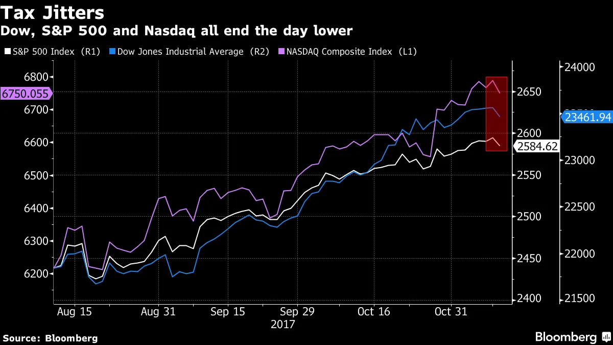 华尔街在星期四学到了一个宝贵的教训:股票有时会大幅下跌。好吧,虽然在纽约时间中午时,标准普尔500指数下跌超过1%时,大家担心的“血洗”并没有发生,但全天的疲软足以提醒投资者,股票并不是单向上涨的交易。另一个收获是税收减免对市场的重要性。尽管盈利增长稳健,投资者需要看到更低的企业税率,以帮助证明那些交易在2018年预期盈利的18倍高估值的股票是合理的。震动市场的是,参议院版本的共和党税改将企业税率从35%降至20%的计划推迟到2019年1月1日。此外,众议院版本法案的修正案将美国公司海外收入的提议税率提高到现金收入14%和非现金持有7%,而一周前众议院筹款委员会主席凯文·布雷迪提出的法案则为12%和5%。