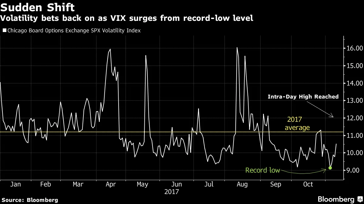 如今,投资者异常紧张,部分原因是似乎每个人都在朝同一个方向下注。彭博新闻的安德鲁·辛科最近报道,投资者情报将的牛市和熊市通讯作者之间的差距已上升至50%,这是自1987年初以来的最大差距,当时达到了50.5%。虽然这并不能保证股票会在短期内下跌,而且有很多好消息支持股票,但这表明现在是特别谨慎的时候。波动性出现市场动荡中的一线希望是波动性正在上升,Cboe VIX指数自8月以来上涨幅度最大。或许更重要的是,彭博新闻的莎拉·庞泽克表示,该指标现在处于今年的平均水平。关于波动性创纪录低水平的担忧并不少见,许多人表示这是一种自满的迹象。该指标在11.07,使用期权交易数据来衡量标准普尔500股票的隐含波动性,仍低于牛市平均水平的18.3。“就我们如何看待世界及其对我们策略的影响而言,若这项改革引发一些不确定性,可能会导致波动性上升,”Gateway Investment Advisers的首席投资策略师大卫·吉莱克告诉彭博新闻。波动性的缺乏特别让中央银行家感到担忧,他们认为这给投资者提供了一个信号,让他们承担越来越大且不合理的风险。事实上,一些策略师和投资者表示,尽管缺乏通货膨胀,美联储提高利率的主要原因是为了防止缺乏波动性导致金融不稳定。美联储理事莱尔·布雷纳德在9月的演讲中表示,在低利率和持续经济增长的时期,“保持对泡沫迹象的‘警惕’是重要的,尤其是在商业房地产和公司债券等领域,以及预期波动性异常低的情况下。”