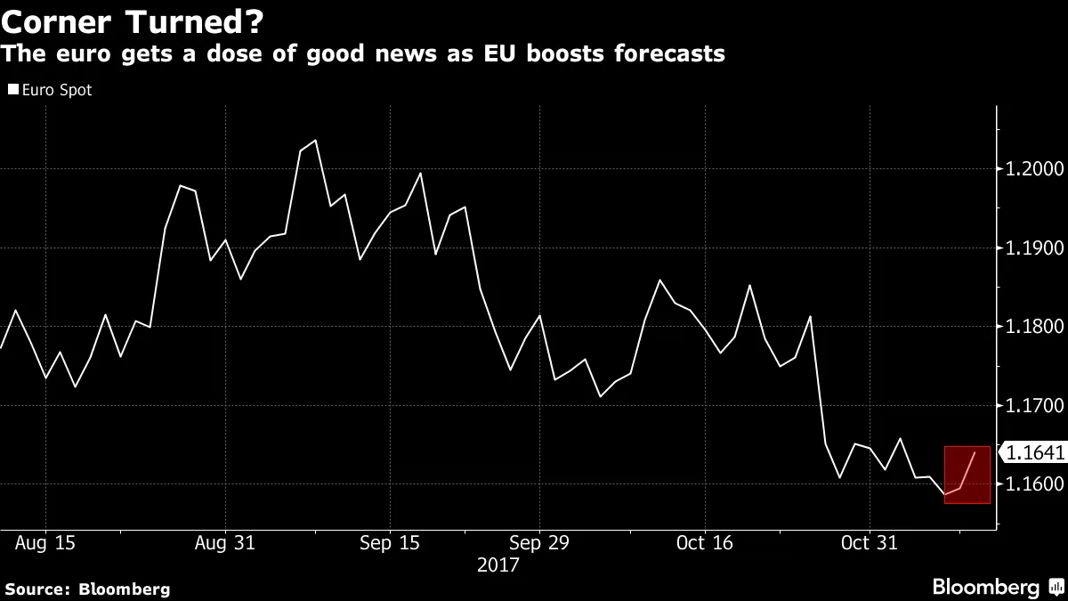欧元获得了一剂强心针欧洲的共同货币在三周内对美元上涨幅度最大,并且在大多数主要货币中表现强劲,除了日元和瑞士法郎,此前欧洲委员会表示,欧元区经济将在十年来最快的速度增长。今年将19国集团的2017年预测从5月的1.7%上调至2.2%,欧盟执行机构引用了“强劲的私人消费”,并预测2018年将扩张2.1%,根据彭博新闻的尼科斯·克里索洛拉斯和维多利亚·登德里努的报道。更乐观的前景对欧元多头来说是个好消息,因为他们看到彭博欧元指数从8月的年内高点下跌了2%。欧洲中央银行执行委员会成员贝诺特·科尔周四表示,恢复是近二十年来在“稳健性和平衡性”方面最强的。经过多年的金融危机应对,欧元区经济已经连续18个季度增长,调查证据表明持续稳健的扩张。这个势头为货币联盟提供了进一步支持,经过一个关键的选举年,反欧盟的民粹主义者在一系列关键投票中被击败。