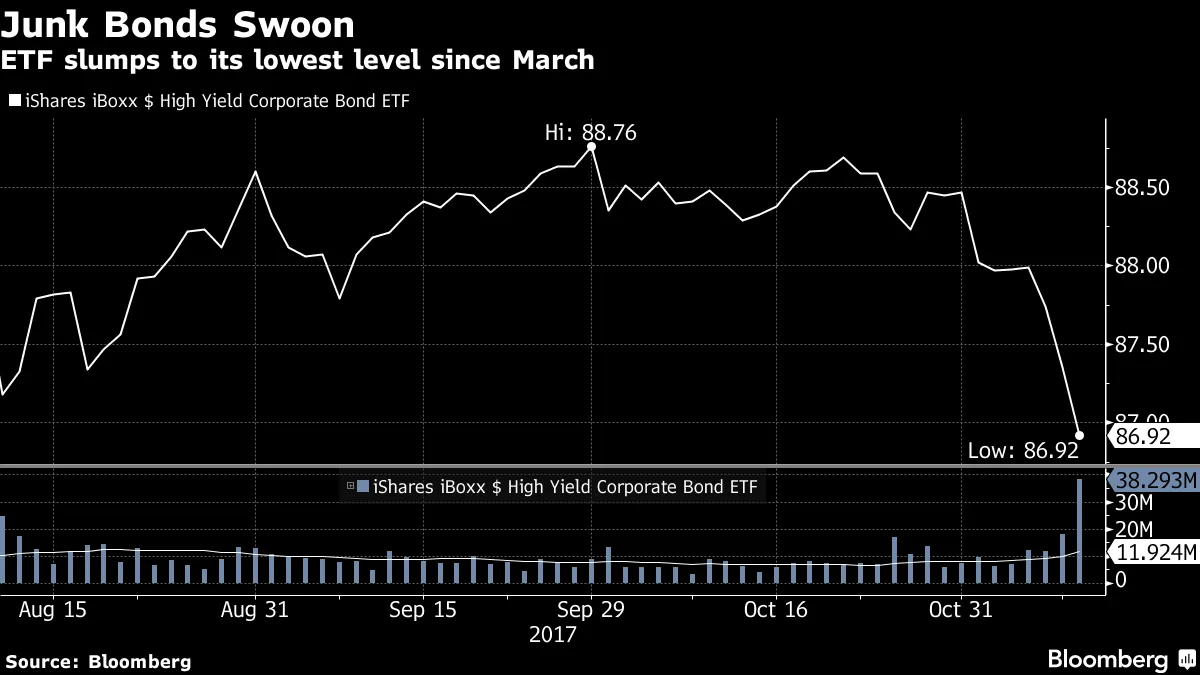 垃圾债券名副其实另一个受到严重打击的市场是评级低于投资级的公司债务。贝莱德的187亿美元iShares iBoxx高收益公司债券ETF跌至自3月以来的最低水平,交易的股票数量超过了日均水平的五倍。更广泛地说,投资者要求额外的3.9个百分点的收益率来持有垃圾债券而不是国债,较两周前的3.56个百分点有所上升。抛售发生在高盛分析师发布报告的同一天,报告指出,尽管美国整体信用质量已扭转恶化趋势,但“内部情况依然具有挑战性。”由于近年来杠杆率上升,“美国非金融企业抵御任何潜在负面冲击的能力大大减弱,”他们补充道。三家最大的垃圾评级借款人,IHeartMedia、CenturyLink和Community Health Systems,发布了令人失望的收益,导致其债券暴跌。摩根士丹利分析师指出,众议院共和党税收计划将限制利息可扣除性,这意味着高收益借款人可能面临更高的税后利息成本。这对于杠杆率已从2011年危机后低点约3.5倍上升至约4.5倍的高收益发行人来说是个问题。可以肯定的是,目前的抛售在规模上与市场在8月初和3月遭受的情况相似,收益率差距远低于一年前的约5个百分点。