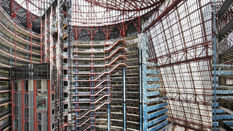 汤普森中心捕获了芝加哥的想象,尽管没有捕获它的心。这座建筑的圆形全玻璃外观以及圆柱形内部中庭,使其看起来像一个外星访客,获得了“星际飞船”的称号。设计实际上是对经典美国州议会大厦的变奏,玻璃墙代表政府透明度,而大型天窗则旨在唤起圆顶的感觉。中庭繁忙的内部涂成红色(或鲑鱼色)、白色和蓝色,也许是这座建筑最刺眼的设计元素。