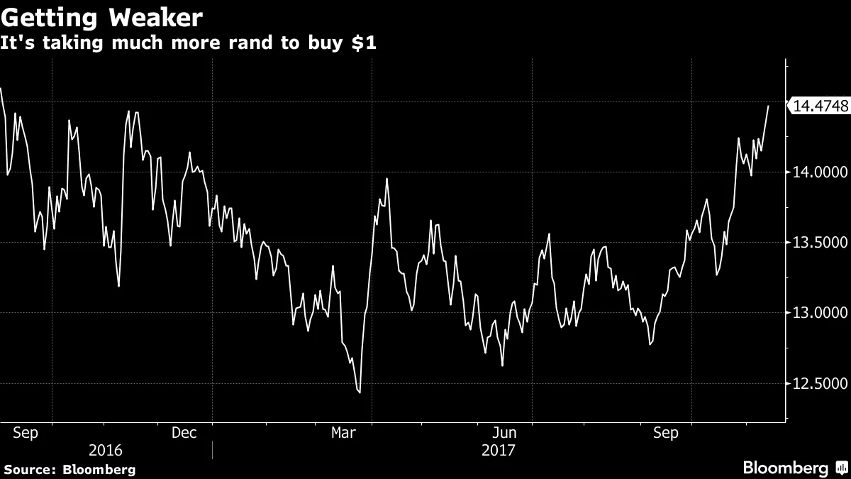 南非从坏到更坏南非兰特,自6月以来在彭博社追踪的31种主要货币中表现最差,正在努力寻找底部,周一跌至12个月来的最低水平。由于该货币的交易活跃,兰特被广泛视为新兴市场的代理指标。根据彭博新闻的科琳·戈科报道,交易员们在防守中,因为有猜测称总统雅各布·祖马准备推翻财政部长马卢西·吉加巴在10月提交的预算,以支付他的免费大学教育计划。南非预算办公室主任迈克尔·萨克斯在祖马办公室要求国家财政部寻找额外资金以资助明年的免费大学教育计划后辞职,《商业日报》报道。南非日益扩大的预算赤字将花费多少,将在周二揭晓,当时该国将举行其迄今为止最大规模的本币债务拍卖,根据彭博新闻的罗伯特·布兰德的说法。吉加巴表示,政府将在未来三年内需要筹集1220亿兰特(84亿美元)的债务以弥补短缺。这意味着将每周固定利率拍卖中提供的票据金额从之前的26.5亿兰特增加到33亿兰特。