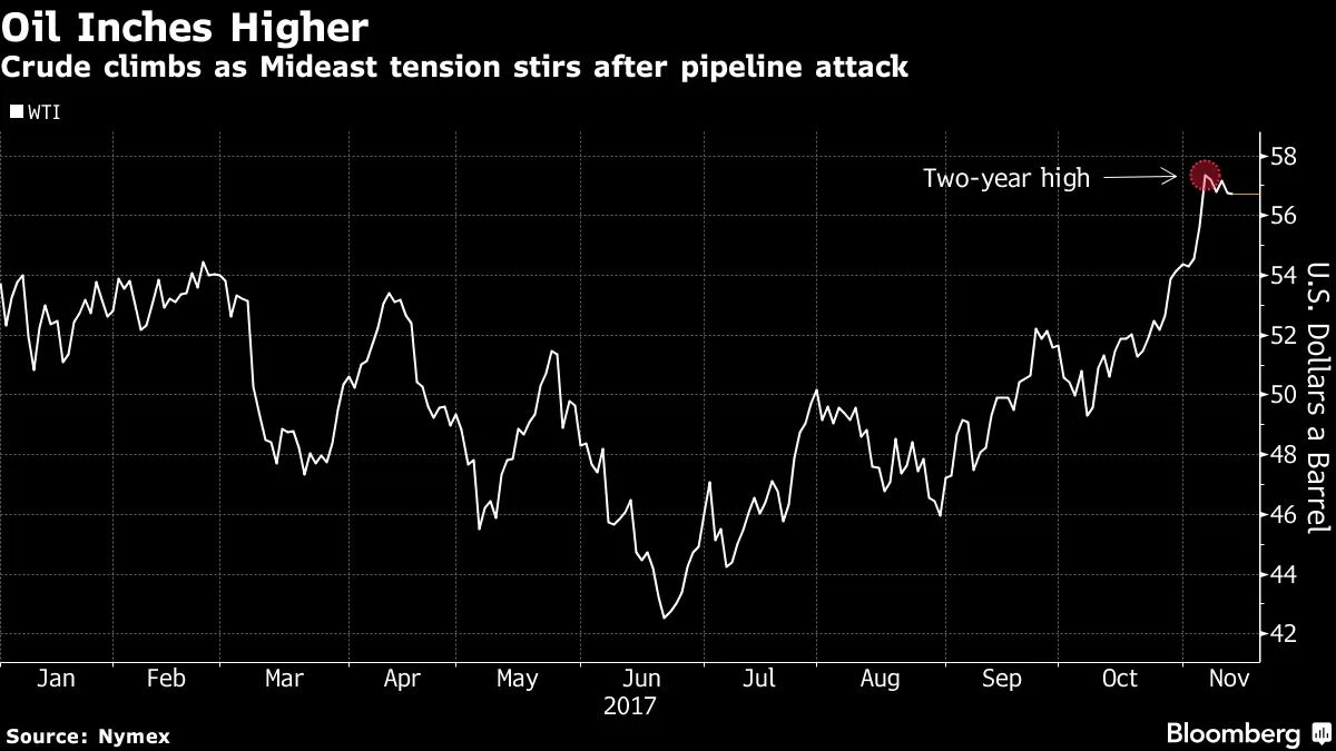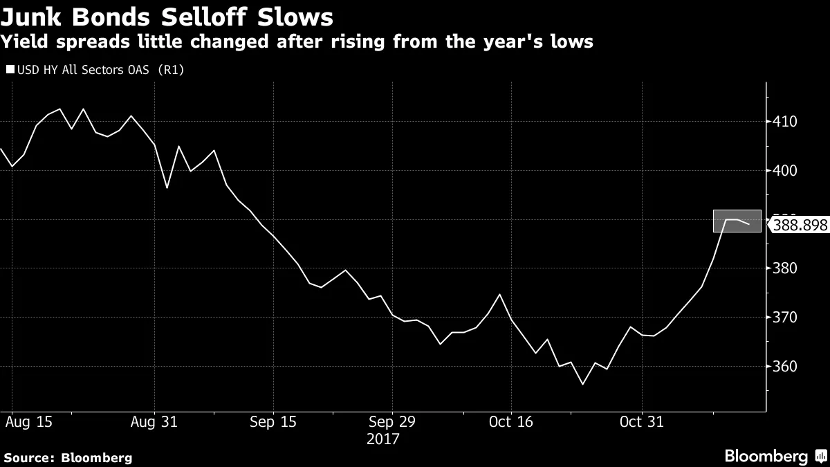 该公司的流动性压力指标接近历史低点2.3%,表明借款人如果需要,仍然有充足的资本可用。投资者唯一可以抱怨的就是收益率和 利差过于紧缩 ,未能补偿他们持有如此高风险债务所固有的风险。“随着利差收窄,投资者获得其票息的机会显然低于一两年前,”伊顿万斯公司的全球收入联合主管Eric Stein在接受彭博电视采访时表示。“如果我们处于一个通货膨胀的世界,利率较高,或者是风险规避和通货紧缩的世界,这对高收益债券可能是一个挑战。”欧佩克的信心投票虽然垃圾债券投资者可能有些怀疑,但至少欧佩克对经济前景充满信心。根据该组织的月度报告,石油输出国组织将明年满足需求所需的日产量预估提高了40万桶,达到每日3340万桶。由于这比卡特尔在第三季度生产的日产量多出约67万桶,如果该组织及其盟友继续限制供应,全球库存将在2018年进一步减少,彭博新闻的Grant Smith表示。即使在提高生产预估的情况下,纽约的原油期货仍维持在每桶约57美元,较今年6月的低点约42美元有所上涨。“随着欧佩克提高预估,市场的紧张程度显然增加,”价格期货集团的高级市场分析师Phil Flynn告诉彭博新闻。“我们已经从过剩的心态转变为更多的再平衡。”欧佩克秘书长Mohammad Barkindo表示,生产限制是重新平衡仍在应对过剩供应的全球市场的“唯一可行选择”,彭博新闻的Meenal Vamburkar报道。