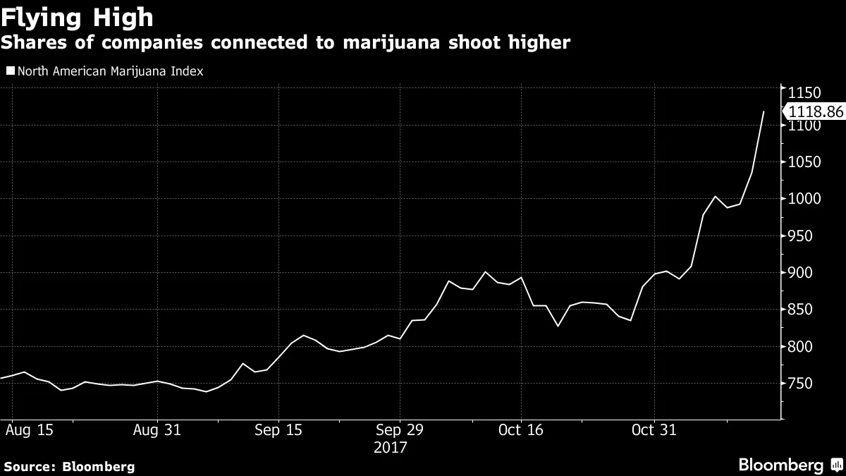 大麻股票处于上涨模式当你有大麻生产商时,谁还需要比特币?与大麻相关的股票正在上涨,正值加密货币在经历了一年的上涨后稍作停顿。北美大麻指数自10月27日以来上涨了34%,自8月底以来上涨了49%。对合法化大麻未来的乐观情绪似乎几乎每天都在增长。民主党人菲尔·墨菲上周当选新泽西州州长,他誓言将在全州合法化娱乐性大麻。彭博社的珍·斯凯里特报道,在加拿大,Aurora Cannabis周一上涨了多达24%,现在本月上涨超过80%,这得益于收入的增长和对其在魁北克合法化大麻市场中能够获得强大市场地位的猜测。Aurora在该省的种植设施获得了种植许可证,使其处于有利位置,安大略省巴里市BCMI报告的编辑克里斯·达马斯表示。与娱乐性大麻相关的公司,区别于医疗大麻,在猜测它们将获得来自酒精饮料公司的投资的情况下,正在大幅上涨,达马斯说。Corona啤酒的销售商Constellation Brands刚刚同意收购Canopy的少数股权,这是酒精公司首次进入加拿大新兴的大麻行业。