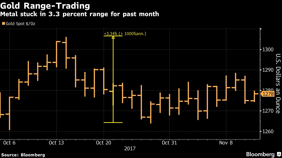 黄金可能会变得有趣黄金投资者最近没有太多事情可做。这种贵金属在一个多月内波动幅度仅为3.3%,是自2013年2月以来任何可比时期中最小的,根据彭博新闻的埃迪·范德·瓦尔特和兰吉塔·帕基亚姆的报道。但至少有一位大投资者押注黄金价格将向上突破。亿万富翁对冲基金经理雷·达里奥不仅在上个季度推荐了黄金。他买了很多黄金。彭博新闻的卢兹·安·哈维尔报道,截至9月底,达里奥的桥水基金,全球最大的对冲基金,几乎将其在SPDR黄金股票中的持有量增加了七倍,并且在iShares黄金信托中的股份增加了三倍多,监管文件显示。达里奥在8月建议投资者考虑将5%到10%的资产配置到黄金中,理由是政治和经济风险。桥水在第三季度增加了332万股SPDR黄金,持有量达到389万股,监管文件显示。桥水还将其在iShares黄金中的股份增加了820万股,达到1130万股,根据文件。