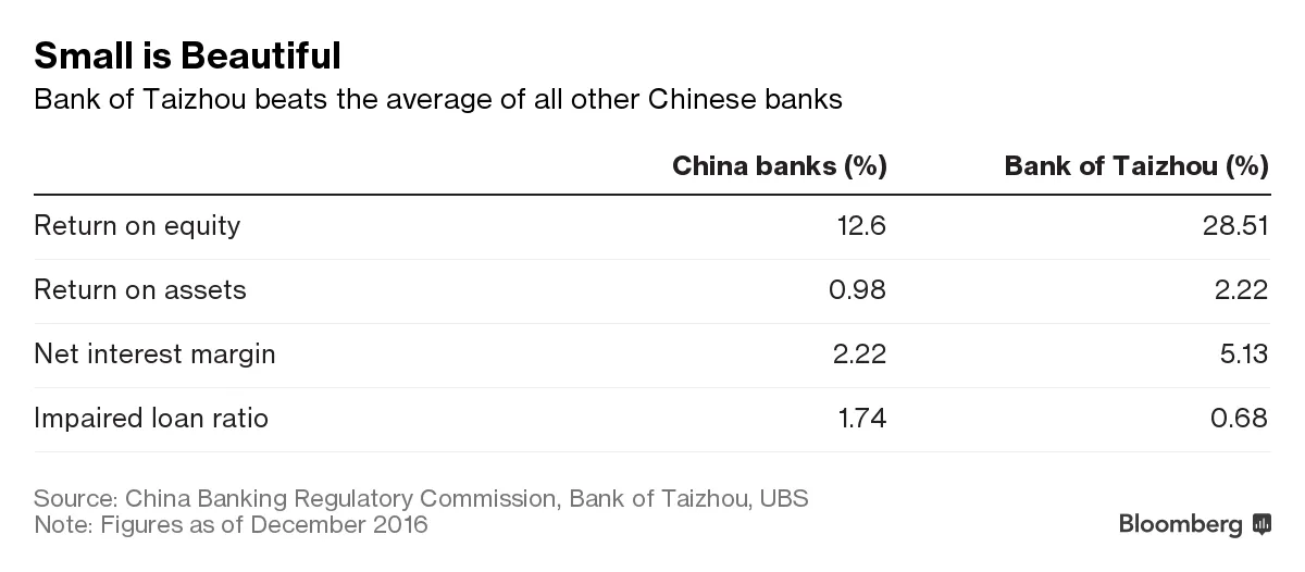 台州银行的平均贷款约为50,000美元,其股东包括吉利汽车控股有限公司。正在展示中国的银行巨头。去年的股本回报率为29%,是同行典型的13%的两倍多。全球最大的贷款机构工商银行的回报率为15%。