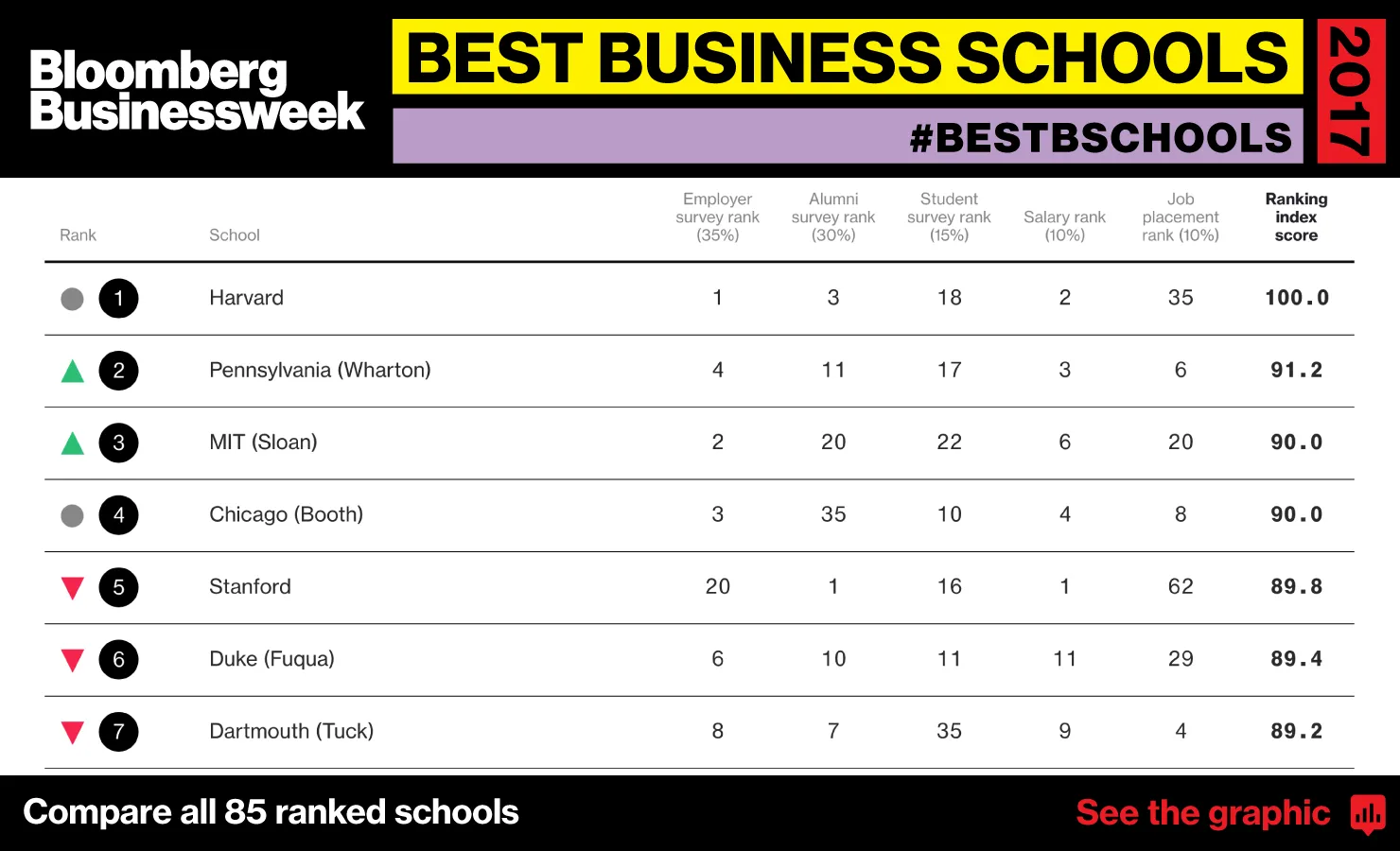 连续第三年,哈佛在 彭博商业周刊的传统两年制全日制MBA项目年度排名中名列第一,该排名对最近毕业的学生、校友和雇主进行调查,涉及学术、就业安置和薪资增长等主题。(该排名不包括获得联合学位或参加兼职项目的校友;完整排名和详细方法可在 bloomberg.com/bschools2017 查阅。)