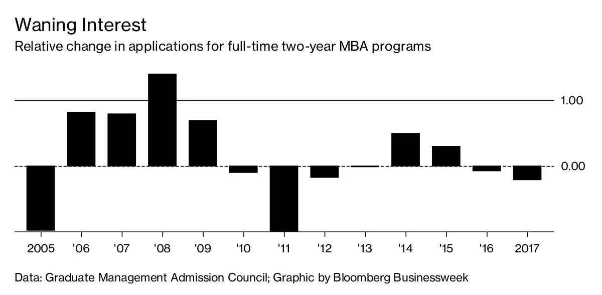 商学院正面临招生低迷。自2015年以来,美国全日制两年制工商管理硕士(MBA)项目的申请人数有所下降。根据研究生管理招生委员会2017年的申请趋势调查报告,去年64%的美国全日制MBA项目收到的申请人数减少。“行业MBA项目普遍收缩,”阿斯彭研究所商业与社会项目的副主任克莱尔·普雷瑟说,该智库研究商业教育的趋势。