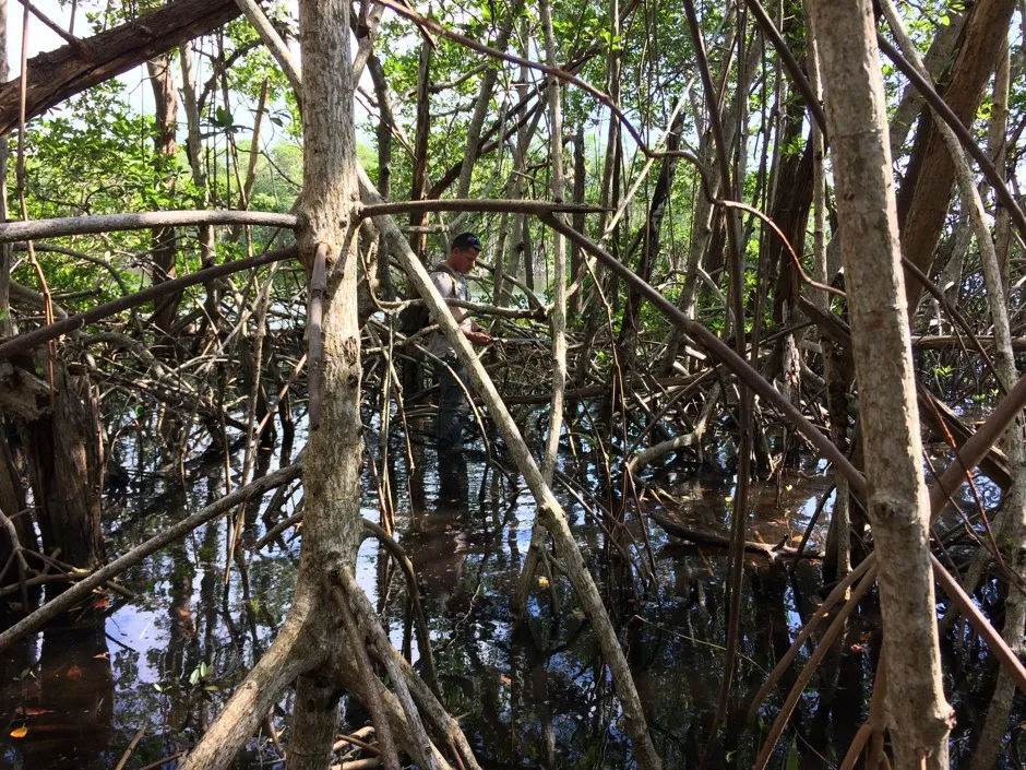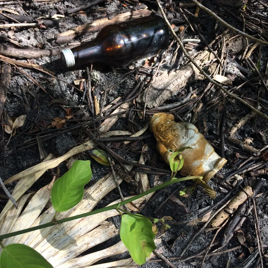 在最近的一个下午,红树林的根部点缀着一些非常现代的垃圾:模糊的玻璃瓶、布满藤壶的冲浪板、一个黑色DVD盒、一袋皱巴巴的Ruffles薯片。艾尔斯-里格斯比说,这些并不是有人偷偷溜进森林当垃圾场的迹象——这些垃圾是被海浪带进来的。