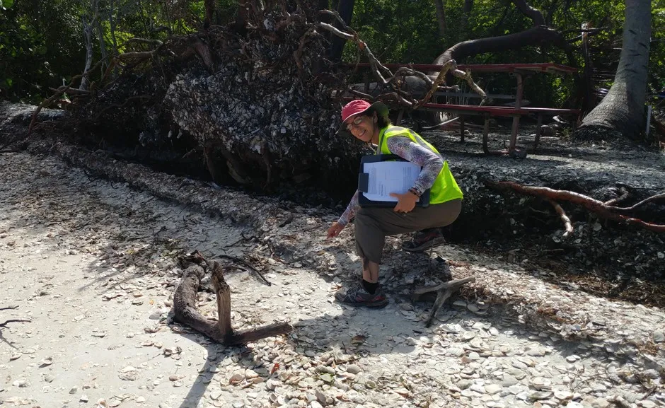 保拉·斯特里特与遗产监测侦察队志愿服务,这是一个监测佛罗里达州濒危考古遗址的项目。保拉·斯特里特提供卡卢萨岛遗址只能通过船或皮划艇到达——“你不能就这样飞过去,”斯特里特说。在最近的飓风和大潮之前,团队打算每月进行一次调查。(该遗址也由佛罗里达大学的研究人员进行监测。)当倒下的树木暴露出这些文物时,团队将频率提高到每周一次——而不是将所有文物留在原地,志愿者们绘制原始位置的图示并将其中一些装袋,以免它们被冲入海中。遗产监测侦察队使用钢筋安装来测量贝壳堆边缘到海滩的距离。即使没有他们精确的计算,也很容易看到波浪和风在暴露的根部和剧烈倾斜的沙丘上的影响。