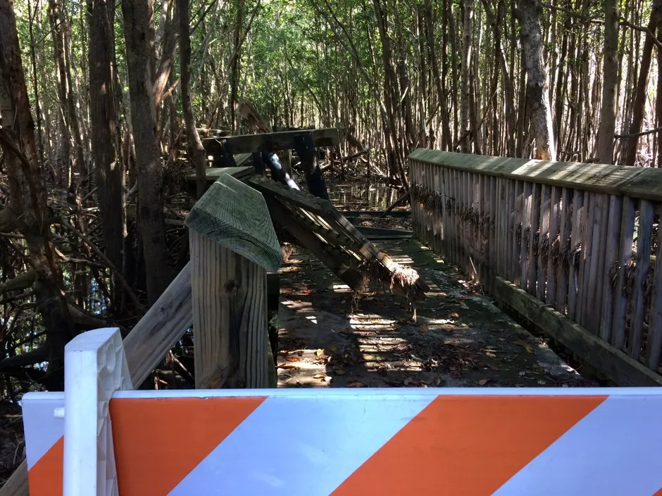 木栈道被伊尔玛飓风摧毁。杰西卡·利·赫斯特/城市实验室伊尔玛本可以造成更大的破坏。但在一些孤立的地方,风暴却是贪婪的。我们经过一段历史悠久的木栈道的碎片,考古学家们曾费力地记录和注释过。该结构在风暴中“被撕扯成块”,东南/西南佛罗里达分支的公共考古协调员马洛里·芬恩解释道。佛罗里达公共考古网络(FPAN)是西佛罗里达大学的一个项目;东南/西南分部在佛罗里达大西洋大学运营。