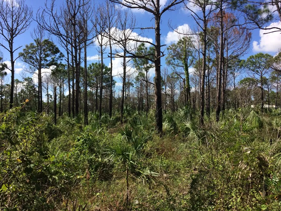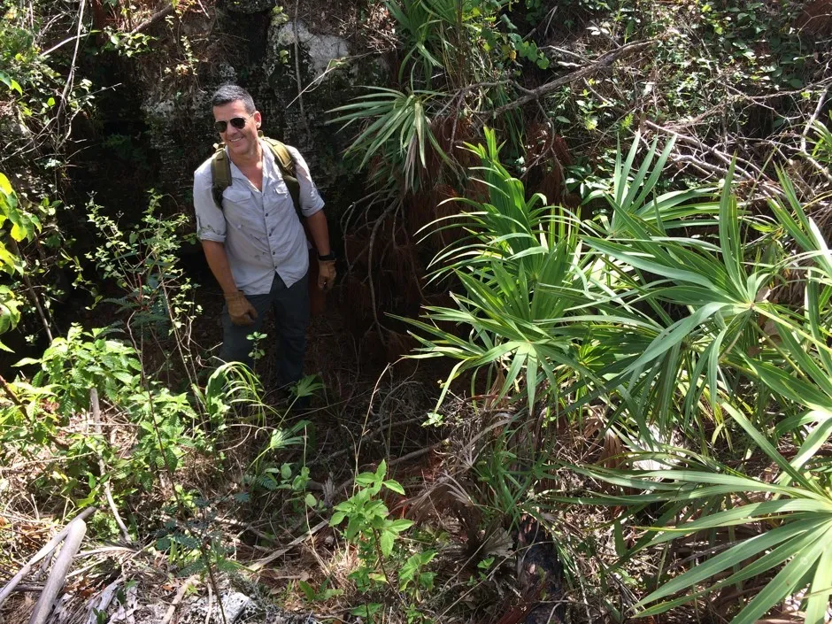 厄玛的风刮掉了德林庄园的树冠,这是一处历史悠久的家园,包含墓 mound 和其他化石遗址,由迈阿密-戴德县公园、娱乐和开放空间部门管理。在那些光秃秃的树枝下,生长迅速,藤蔓和嫩芽——由海藻沉积物滋养——争夺阳光。结果是第二次春天:明亮、年轻的叶子,贪婪地在甘蔗树和缠绕榕树之间寻找立足之地。兰索姆用他随身携带的砍刀为我们开路。他用砍刀劈了两下巴西胡椒树枝——但那只是因为砍刀钝了,他告诉我。通常,一下就足以像切黄油一样直接切过。