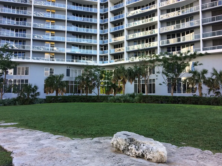 迈阿密圈遗址现在被豪华公寓和酒店所包围。杰西卡·利·赫斯特/城市实验室在厄玛飓风期间,水流突破了迈阿密圈遗址下方的墙壁。水流涌上草地,带来了从河里冲刷过来的棕榈叶。住在附近的芬恩“几乎在我们被允许外出后的第二秒就跑了出去”,去查看情况。水很快退去,没有明显的损坏。这个特定的地方,填充物丰富,已经加固以抵御这种类型的冲击。