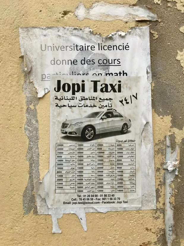 贝鲁特语言堆叠的典型例子。Kaveh Waddell/CityLab在一个安静的贝鲁特公园对面的标志上,广告宣传了一项出租车服务:“为每个人,随处可及,”标志上用法语写道。“白天和夜晚,”标志的另一面用阿拉伯语写着。附近的墙上贴着两张打印纸。其中一张广告出租公寓,用英语、法语和阿拉伯语的拉丁字母音译提供不同的信息。在旁边贴着的皱巴巴的页面上,一家水烟外送服务用阿拉伯语列出了其口味——在阿拉伯语和拉丁字母之间交替——并用英语吸引顾客,提供“免费送货”的优惠。