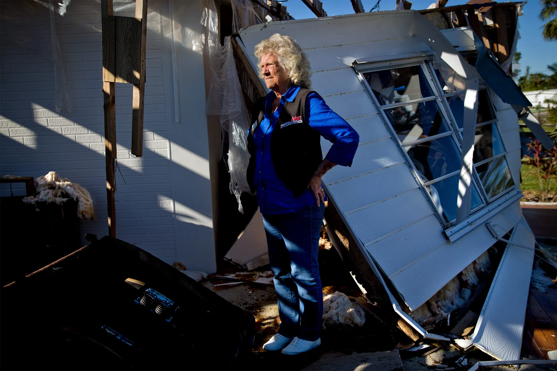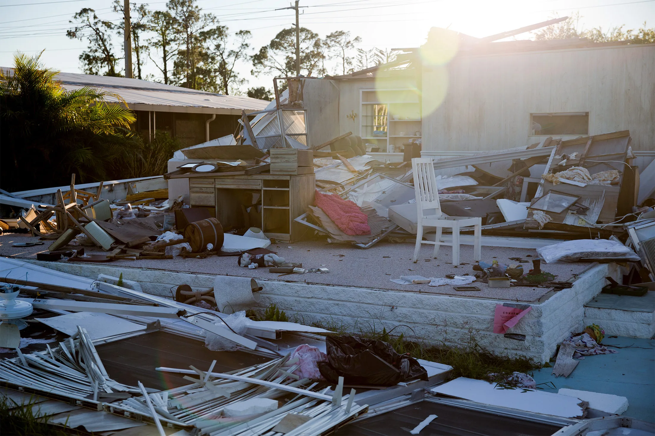 上个月,73岁的五金店店员朱迪·戈夫,她在佛罗里达州那不勒斯的双宽房屋被炸得粉碎,驶入了LeeCorp住宅公司的销售场地,游览了带有厨房岛和拱形天花板的模型。在销售员的办公室里,她得到了总价,包括车棚、税费和拆除她被毁坏的拖车:$140,000。“我没有那么多钱,”戈夫在她旧家废墟中站着,墙壁和天花板被剥离,只留下她的皮革家具和一生的财物在阳光下暴晒。“那是我所有的财产。”