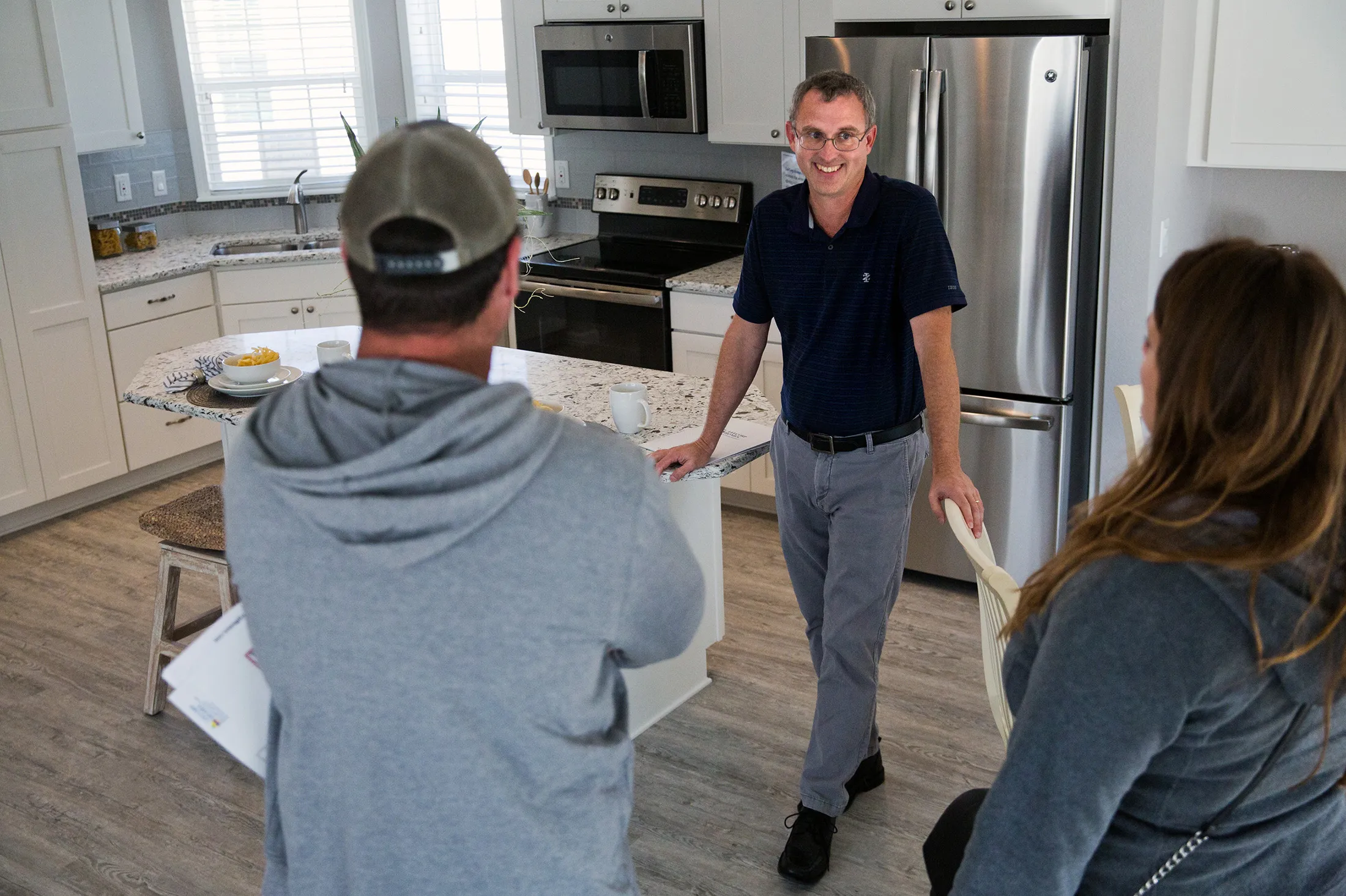 LeeCorp的销售员布莱恩·范·奥斯多尔带客户参观“岛屿者”。摄影师:斯科特·麦金泰尔/彭博社LeeCorp的单宽房屋起价在60,000美元以上。最贵的双宽房屋,有些配有定制浴室和步入式衣橱,售价超过250,000美元。场地上的六款模型经过精心布置,吸引人,配有豪华沙发、真实犯罪小说和海滩小饰品。展示品是“岛屿者”。由佛罗里达州的雅各布森住宅公司建造,厨房配有石英台面,带长椅的玻璃和瓷砖淋浴,定制橱柜配有缓闭门,以及一个露台。