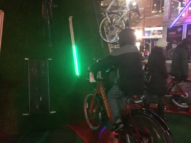 一个孩子停下脚踏车,检查他面前的仪表。琳达·普恩/城市实验室今年,银泉的树是绿色的——但不仅仅是因为它覆盖着鲜艳的人工草坪。这个装置完全由可再生能源供电:太阳能电池板嵌在装饰结构的旧自行车之间(这些自行车稍后将捐赠给当地家庭)。在顶部,树的明星是一个小型风力涡轮机。来自华盛顿特区的资本共享单车的十几辆自行车都被接线以产生足够的电力来驱动一个300瓦的发电机,当它们在使用时,所有这些自行车将使树的圣诞灯在夜间亮起。作为额外的好处,也许是为了让人们真正踩踏,每个自行车站都配备了一个USB端口来为手机充电。