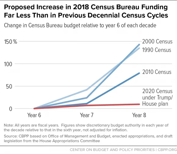 专家们已经担心2020年人口普查将 因预算不足而低估人口。尽管十年一次的人口普查的彩排即将开始,但人口普查局的资金远未达到必要水平。根据 预算与政策优先中心,以往的政府在普查前都会大幅增加资金。白宫和国会在2018年仅提议为人口普查局增加2%的预算。