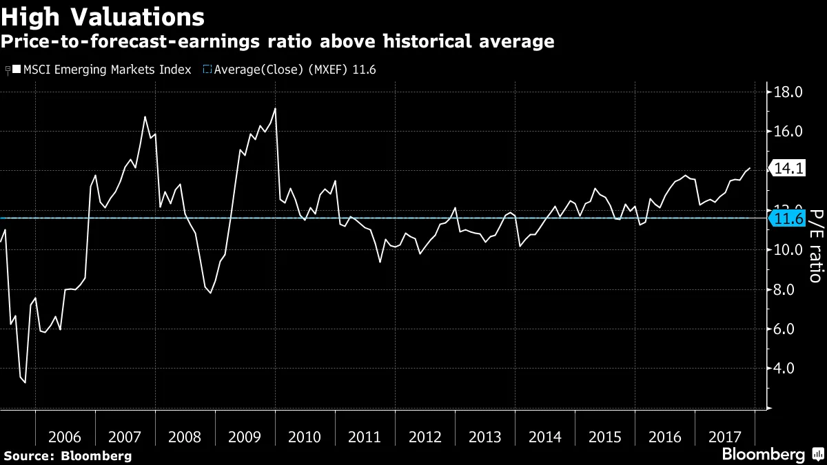 这并不是说没有一些反对者可以抓住的论据。在对2018年增长的预测中,经济合作与发展组织还表示资产价格已经过高,对于明年即将达到顶峰的全球经济来说。此外,彭博新闻的史蒂夫·马修斯报道,芝加哥大学布斯商学院对经济学家的调查——这项调查包括共和党人、民主党人和独立人士——发现只有38名受访者中的一名同意十年后,GDP在减税后将比现状大幅提高;39%的人不确定,58%的人不同意。新兴市场获得新动力尽管美国股票今年表现良好,但新兴市场股票的表现更佳。那些在今年的巨大反弹中正确做出看涨判断的投资者表示,现在没有理由撤出。尽管MSCI新兴市场指数今年已经上涨33%,但投资经理和来自高盛、阿什莫尔集团、摩根大通和法国巴黎银行资产管理等公司的策略师表示,预计经济增长将继续推动2018年的收益增长,估值处于合理水平,彭博新闻的阿琳·小山报道。实际上,他们押注于第二年接近5%的经济扩张预测将继续推动收益。“强劲的走势将持续,因为改善周期才刚刚开始,”阿什莫尔的投资经理爱德华·埃文斯告诉彭博新闻,他帮助管理近590亿美元的资产。他的主要超配头寸在中国,偏好银行和电子商务公司,以及在巴西,偏好能源和材料生产商。埃文斯表示,预计2018年股价平均将再次实现两位数的增长。根据小山的报道,预测市盈率已从年初的13.5上升至14.1,超过历史平均的11.6。