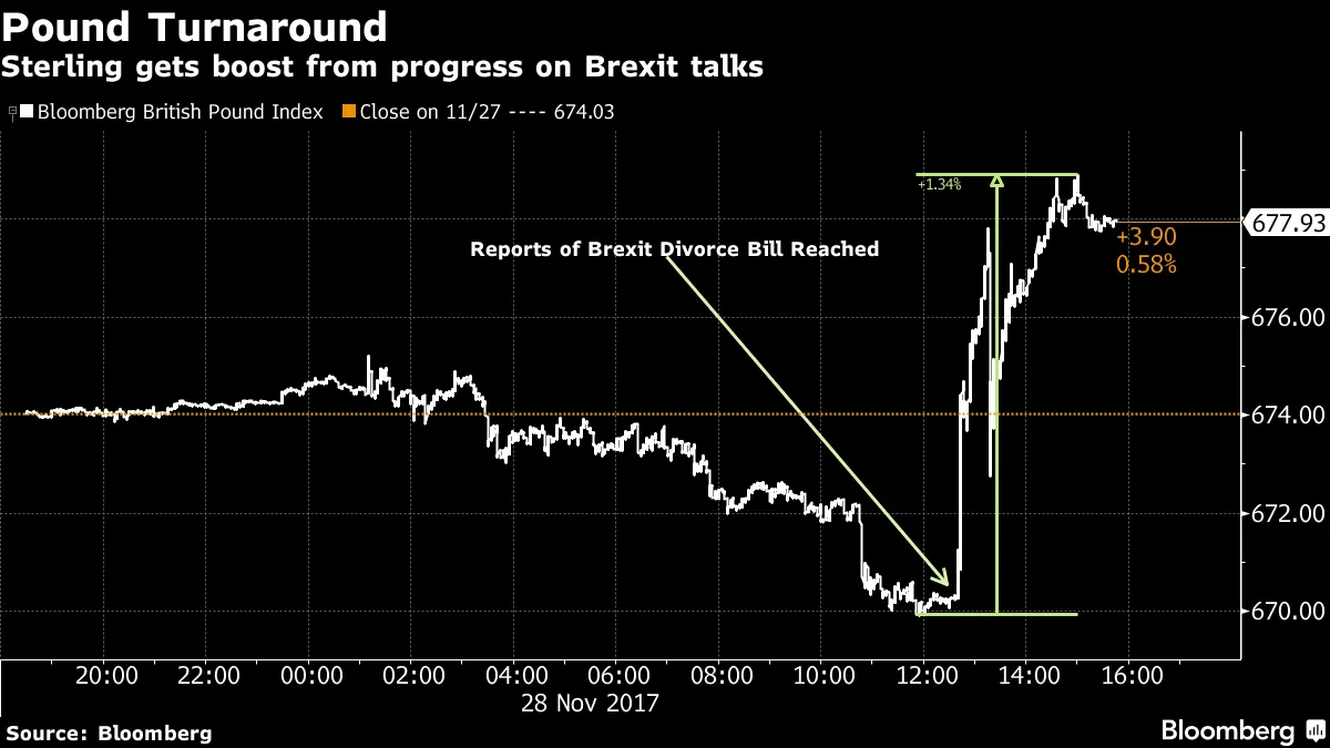 英镑云雾开始消散周二货币市场的重大新闻是,交易员们可能终于对英国英镑的未来有了一些清晰的认识。英镑突然扭转了其损失,彭博英镑指数在《电讯报》的一份报告中上涨了三周以来的最大幅度,该报告称英国和欧洲谈判代表已就英国退出欧盟时将支付的财务结算达成协议,消除了谈判中的一个主要障碍。该报称,双方已原则上达成协议,引用了未透露身份的谈判双方人士。该数字故意模糊,将在450亿欧元到550亿欧元(530亿美元到650亿美元)之间,《电讯报》报道。英国首相特蕾莎·梅和欧洲委员会主席让-克劳德·容克将于12月4日会面,进行一场被认为是达成离婚问题协议的午餐,彭博新闻的艾玛·罗斯-托马斯表示。这将使得12月中旬的峰会上,领导人可以宣布在分离条款上已取得“足够的进展”,以便开始讨论英国与其最大贸易伙伴之间的未来关系。