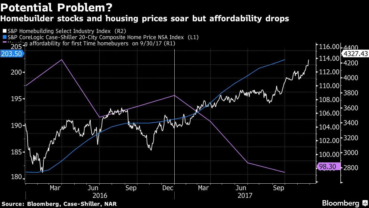 住房正在蓬勃发展,但有一个重大警告房屋建筑公司的股票正在飙升,标准普尔住宅建筑精选指数今年上涨了26.8%,而标准普尔500指数上涨了17.3%。LGI Homes、NVR和DR Horton是该指数中最大的赢家。由于自2001年以来最低的失业率、消费者信心上升和稀缺的库存,房价已经飙升。标准普尔CoreLogic Case-Shiller周二发布的数据表明,20个主要美国城市的房价在九月份上涨了自2014年7月以来的最高幅度,即比去年上涨了6.2%。根据彭博新闻的肖布哈娜·钱德拉的说法,房产价值的上升也在帮助提升房屋净值并支持消费者支出,这是经济中最大的部分。然而,有一个问题可能会在未来造成麻烦:根据全国房地产经纪人协会周二的报告,首次购房者的住房负担能力在第三季度下降至自2008年底以来的最低水平,因为房价的上涨超过了工资的增长。