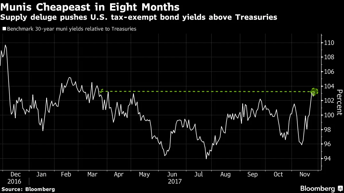 在哪里找到便宜的债券坏消息是市政债券价格在过去三周内下滑。好消息是它们现在相对于美国国债是自三月以来最便宜的。根据彭博新闻的马丁·布劳恩的说法,这一暴跌是由于在国会实施大规模变革之前,借款的热潮被触发,这些变革将从一月开始撤回对大部分免税债券市场的补贴。计划销售的结果量跃升至13个月来的最高点240亿美元。因此,30年期免税债务的收益率已跃升至约103%的国债收益率。所谓的市政债券通常由于其免税地位而收益率低于国债。根据彭博情报的策略师的说法,2017年市政市场的故事偏向于更高的需求而不是更多的供应,因为持续的净负供应对市政债券相对于国债造成了逆风。虽然可见供应在增加,但根据实际供应与可见供应之间的历史关系,可能进入市场的实际债券销售水平可能轻松翻倍,BI策略师指出。