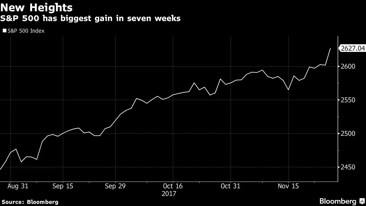 那些警告投资者推高股票到新高度的反对者在周二无处可寻,因为股市在各方好消息的推动下创下新纪录。即使是总统唐纳德·特朗普发推称下个月美国政府可能面临停摆,或关于朝鲜再次发射弹道导弹的报道,也无法阻止标准普尔500指数创下今年最佳交易日之一,彭博美元现货指数连续第二天上涨,垃圾债券也在走强。相反,投资者从华盛顿似乎在税制改革上取得的稳定进展、消费者信心飙升以及美联储主席提名人杰罗姆·鲍威尔在参议院确认听证会上发表的一些市场友好评论中获得了启示。好消息在大多数投资者还未起床之前就开始了,巴黎经济合作与发展组织预测全球经济将在2018年增长3.7%,这将是多年来的最佳表现。随后,会议委员会的美国消费者信心指数在11月意外改善,创下17年来的新高。鲍威尔表示金融规则“足够严格”的评论只增添了好氛围。有什么不好呢?