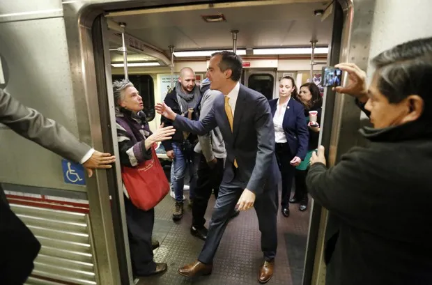 他上任了:洛杉矶市长埃里克·加塞提在2016年12月迎接地铁红线的乘客。美联社备受瞩目的2016年地铁博览线第二阶段的开通,首次通过铁路将市中心与圣塔莫尼卡重新连接,自1953年以来的第一次。尽管博览线可能并没有显著改善旅行时间(全程大约需要50分钟,比高速公路慢,除非在最糟糕的交通堵塞中),但它代表了一个象征性的转变,在这个公共交通长期被视为最后选择的城市中。