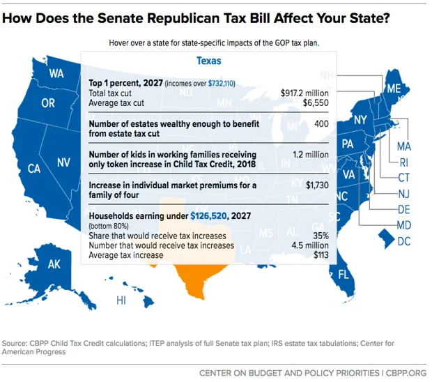 如果本周参议院投票通过共和党的税收方案,4月15日对许多美国人来说将比现在更远离假日。预算与政策优先中心展示了如何通过其互动地图显示众议院和参议院计划在州级的影响。根据这两种版本的法案,企业和高收入者将向山姆大叔支付更少的税款,但大多数低收入和许多中等收入的居民在最昂贵和人口最多的州将遭受损失。