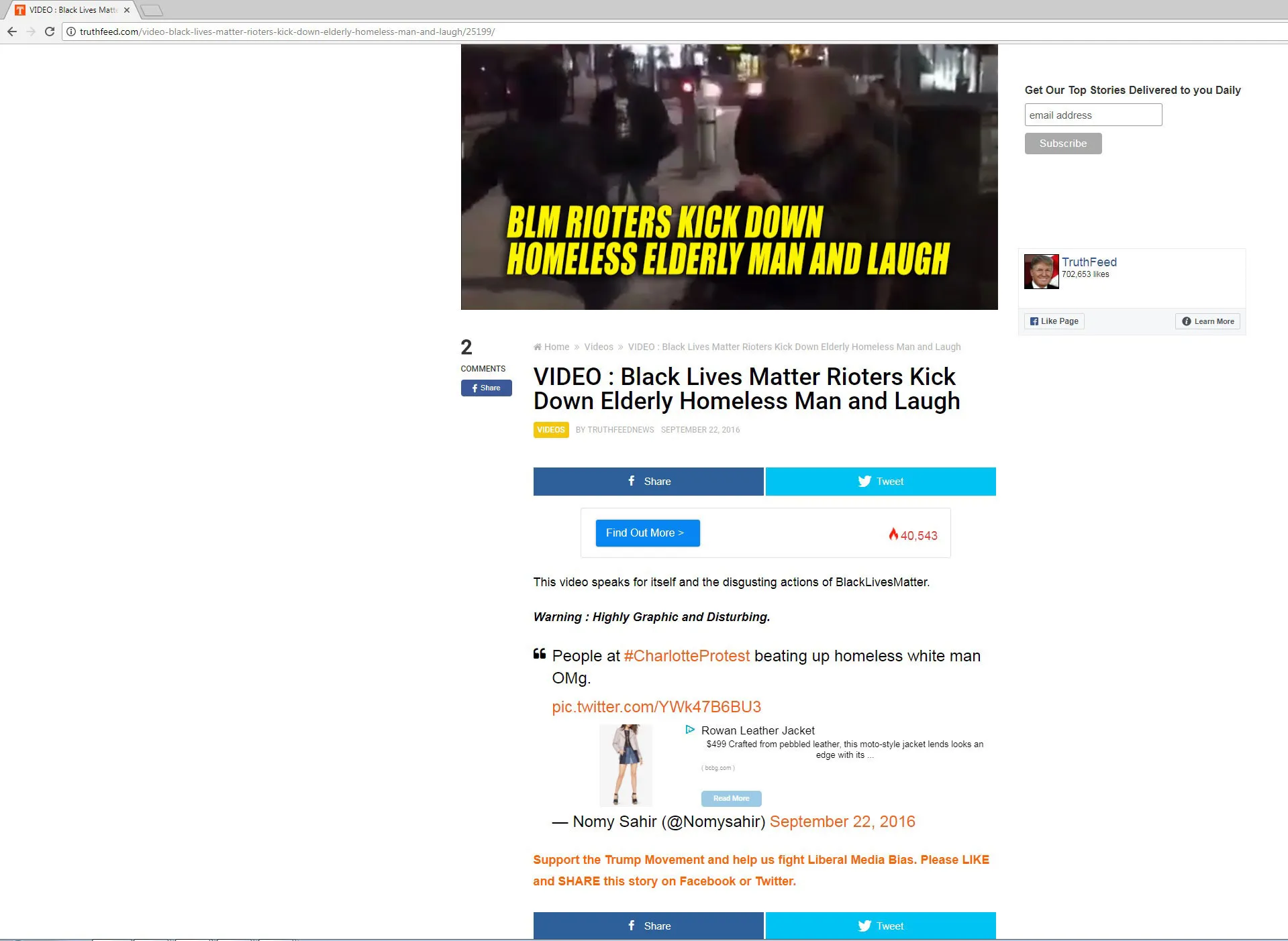 在 彭博商业周刊 询问后,从Truthfeed网站上删除的文章截图。在Truthfeed的案例中,其大量不准确的故事常常污名化少数群体,例如2016年9月22日发布的一篇标题为“黑人的命也是命抗议者踢倒一名年迈的无家可归者并大笑”的文章。它声称展示了一段在北卡罗来纳州夏洛特发生的残酷袭击的视频,正值在凯斯·拉蒙特·斯科特被警方枪击后爆发的抗议活动中。“这段视频不言而喻,揭示了黑人的命也是命的可恶行为,”Truthfeed写道。实际上,该视频当天早些时候出现在一篇关于在伦敦发生的殴打事件的英国小报文章中,与黑人的命也是命无关,距离事件发生地有4000英里。一些故事在 彭博商业周刊 询问Truthfeed后被从网站上删除。