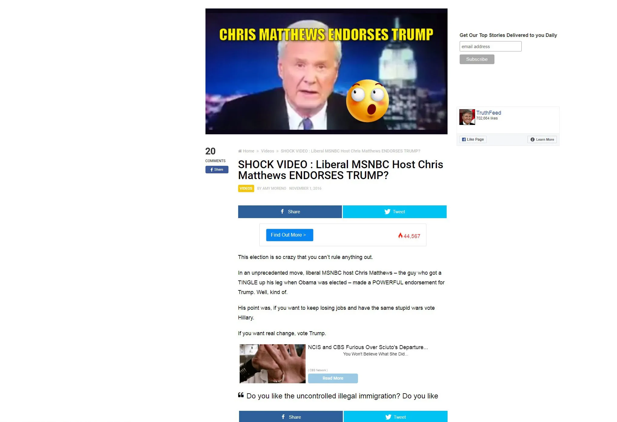 彭博商业周刊机器人出租车的裁决已出——华尔街正在乘坐火车杰米·戴蒙担任财政部长:这个想法从未消失贾伦·布伦森是 NBA 现在需要的球员深入了解设定体育博彩赔率的公司这是一篇典型的 Truthfeed 文章,该网站有隐藏的财务支持者,于 2016 年 4 月上线,当时特朗普正在努力击败他在共和党初选中的对手。尽管只有两名主要作者,Truthfeed 的文章在 Facebook 上被分享了数百万次——大约是 750 人的 华盛顿邮报 新闻室的四分之一——通过发布支持特朗普和攻击其对手的故事和模因。“泰德·克鲁兹属于一个激进的邪教吗?”这是该网站最早的文章之一。与 2016 年选举期间出现的其他数十个网站的文章一样,Truthfeed 的文章范围从极端党派(“希拉里最新的失控咆哮显示了她是多么的失败者”)到彻头彻尾的虚假信息(“克里斯·马修斯支持特朗普”)。
