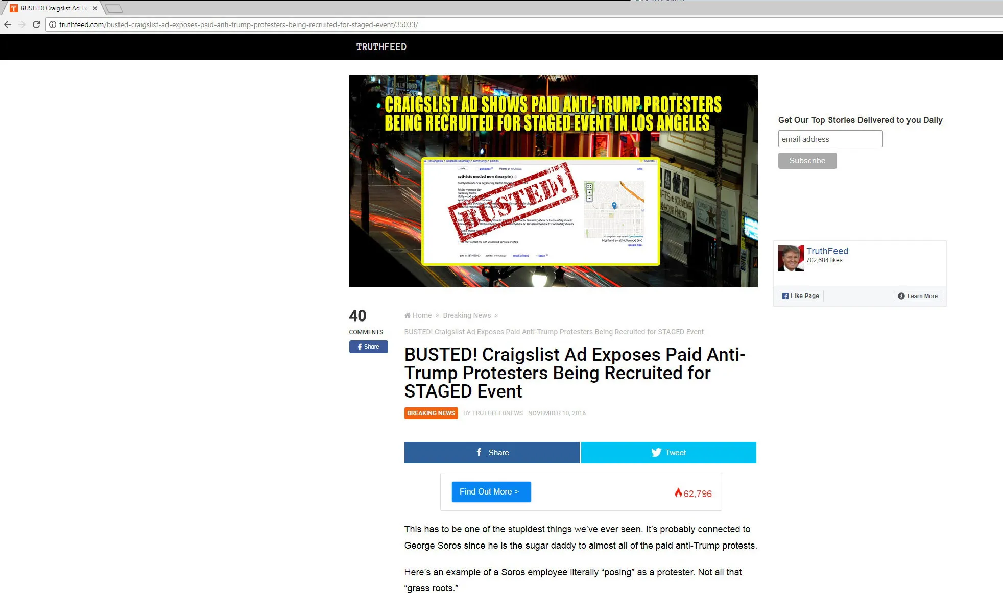 Truthfeed的最高优先事项似乎是支持特朗普。在他当选后的几天里,当全国各地的示威活动如火如荼时,特朗普发推称许多参与者是“职业抗议者”。与此同时,Truthfeed发布了一系列文章暗示同样的事情。其中一篇标题为“被抓!Craigslist广告揭露为STAGED事件招募的付费反特朗普抗议者”,是基于一则似乎呼吁示威者的广告。广告中宣称“现在需要活动家”,并敦促对“愚蠢行为”的“和平回应”。